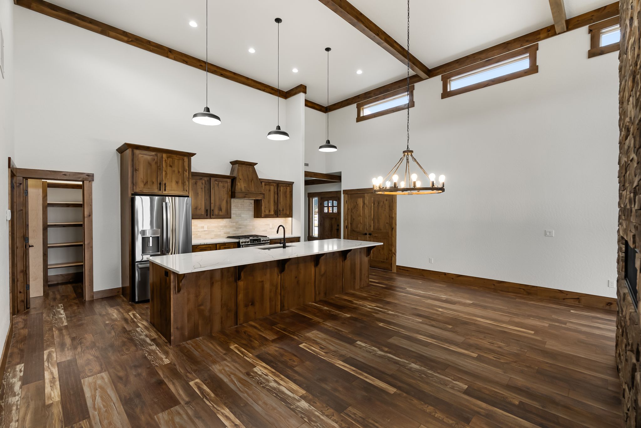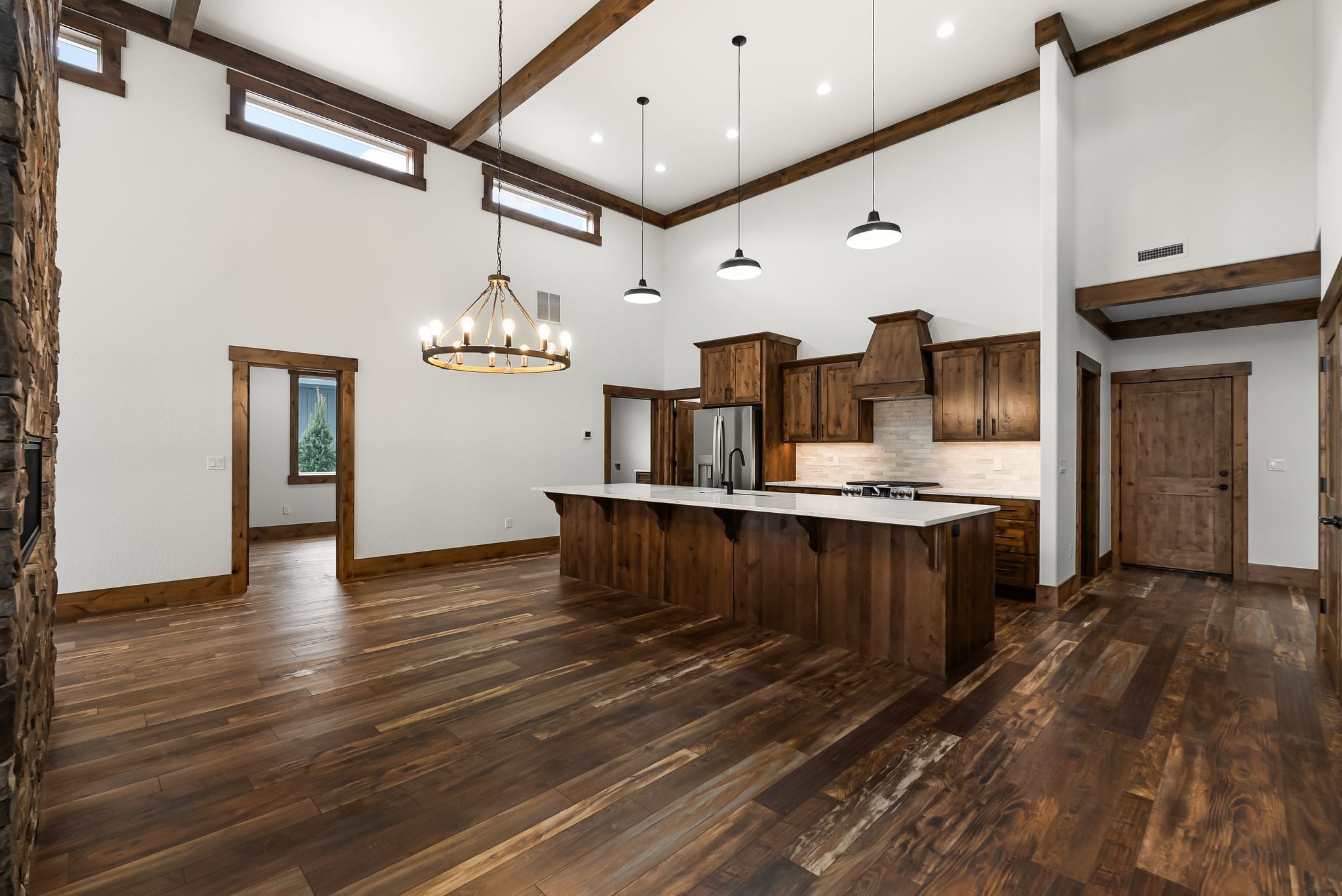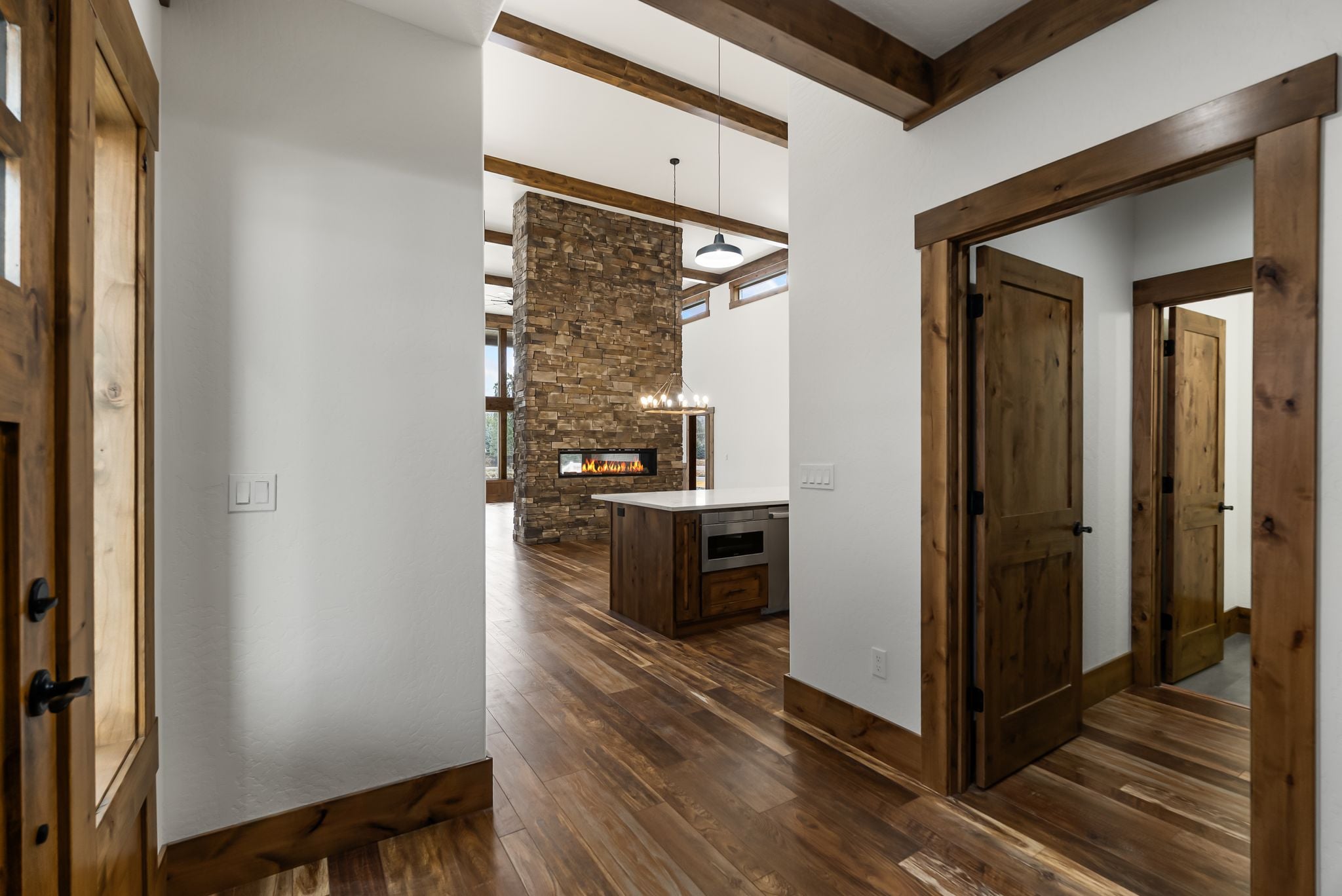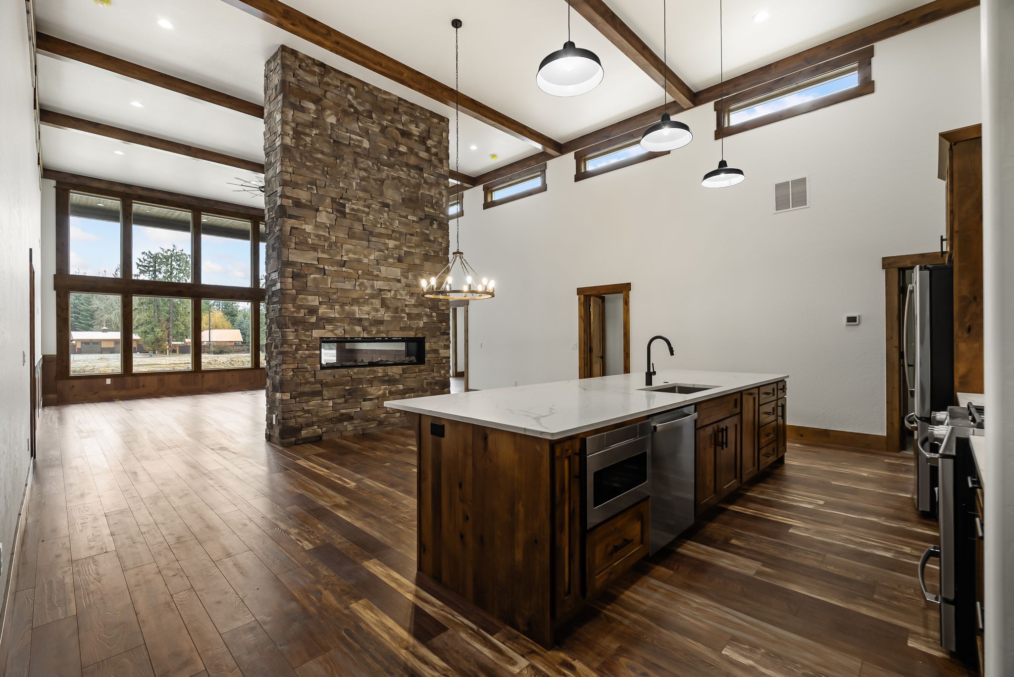 Adventure lives easily at The Barn Owl, where design, function, and the spirit of the outdoors come together in a home that feels both refined and rooted. Set in The Lodges at Providence just outside Sandpoint, this 3-bedroom, 3-bath retreat was built for those who want their home to be as inspiring as the landscape around it. Soaring 16-foot ceilings with wood-wrapped beams and floor-to-ceiling windows flood the space with natural light and views of Schweitzer’s distant peaks. At the heart of the home, a 16-foot-tall stone-clad, double-sided fireplace brings warmth and presence, connecting the living and dining spaces with style and soul. In the kitchen, a 12.5-foot granite island, walk-in pantry, and rich knotty alder cabinetry create a space equally suited for quiet mornings or weekend hosting. The layout includes a Jack and Jill suite and a serene primary retreat. With a 3-bay garage and RV bay, The Barn Owl is more than a home—it’s a basecamp for life well-lived.