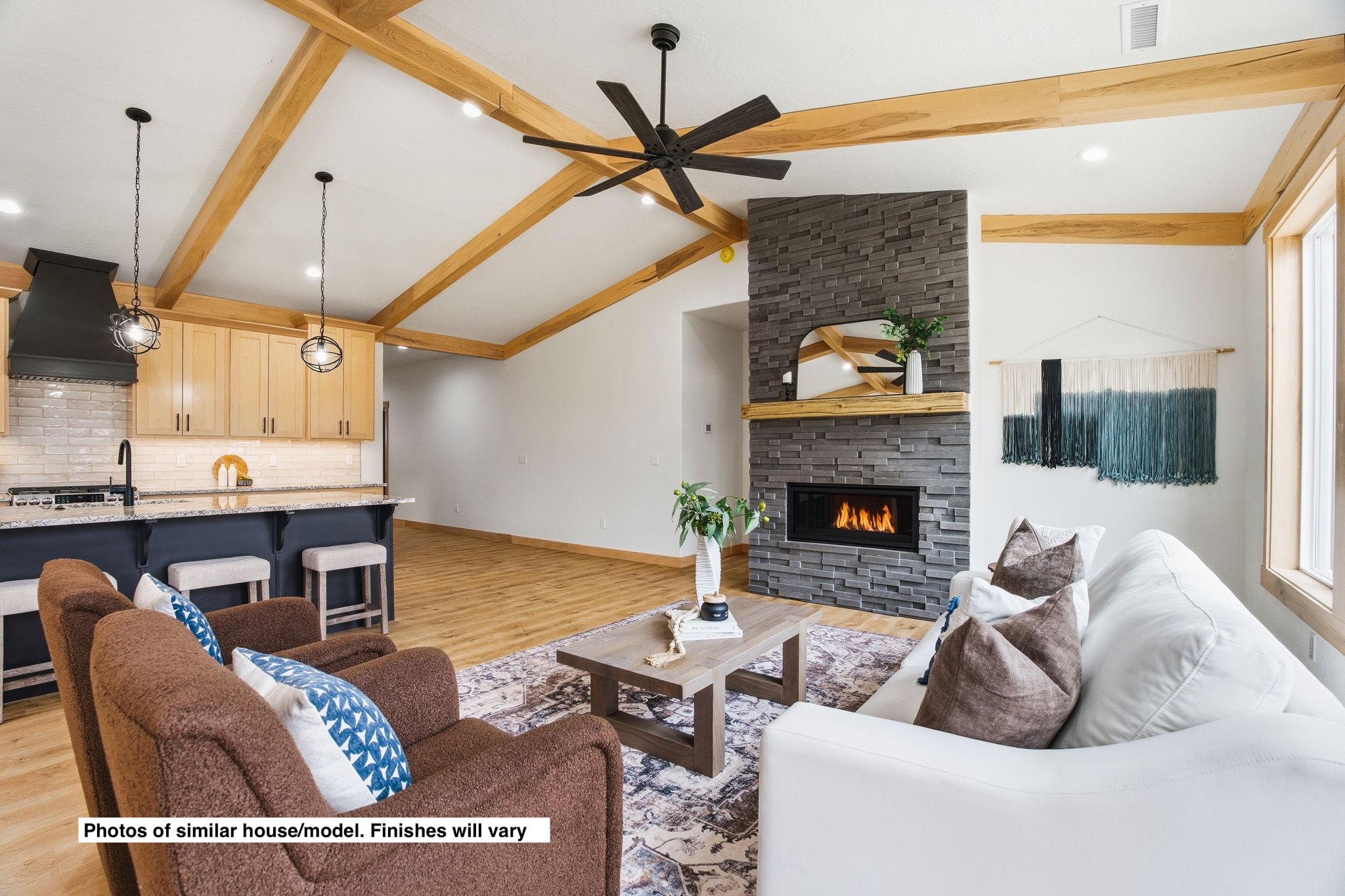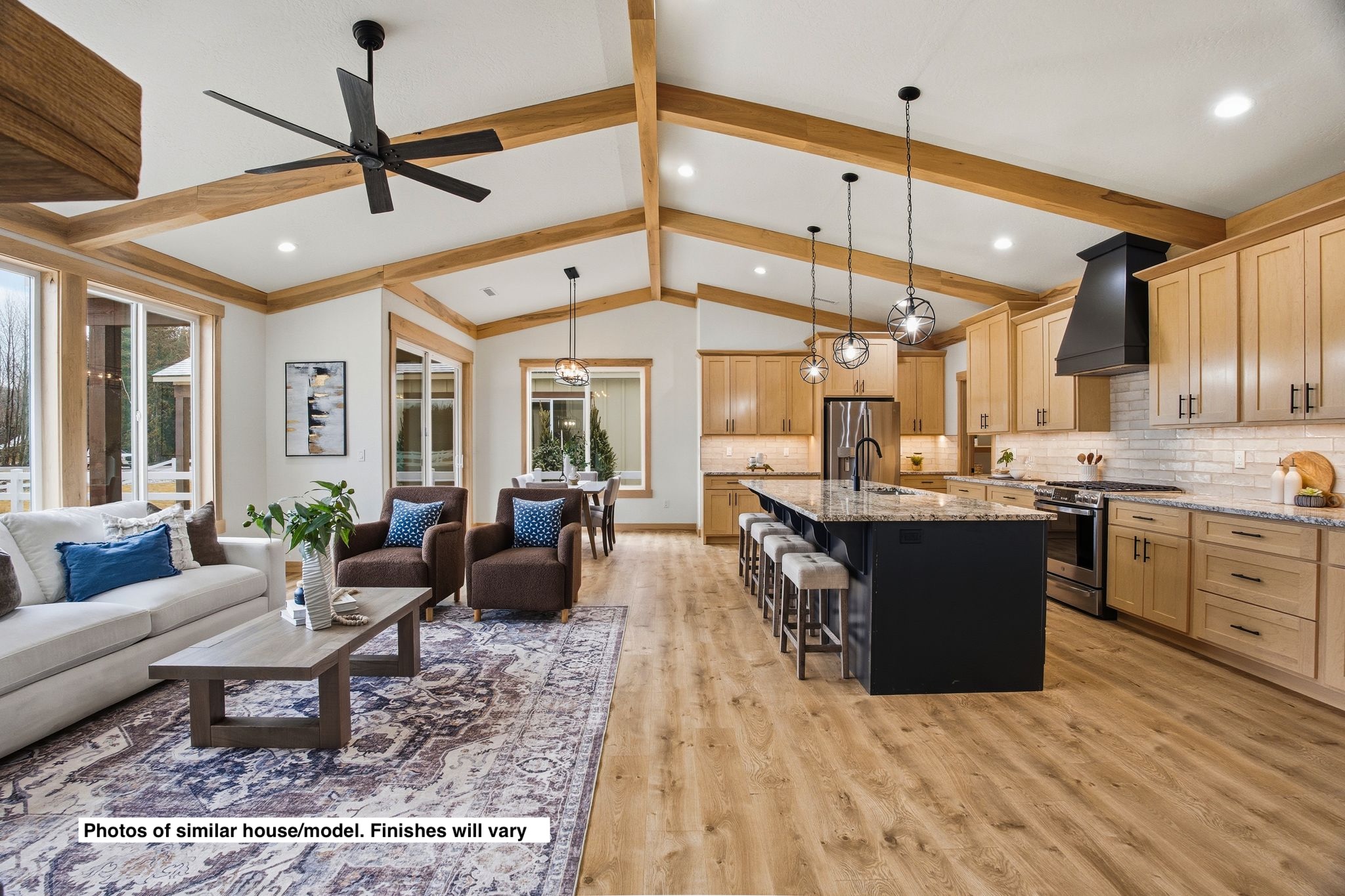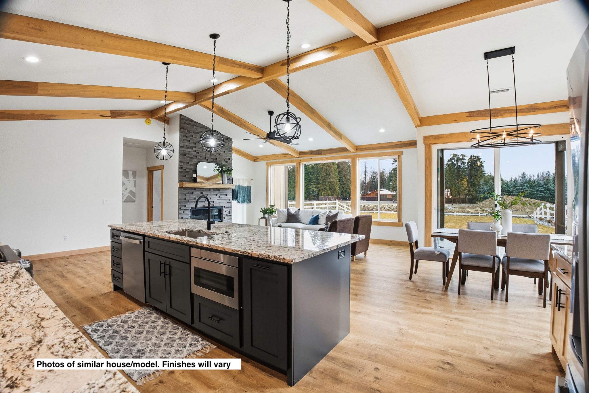 Some homes offer a place to live; this one offers a way of life. At The Moose, mornings begin with light spilling through windows that frame Schweitzer's snow-dusted peaks, and weekends are filled with spontaneous lake days, tee times at the nearby Idaho Club, or first tracks on the mountain. Located in The Lodges at Providence, just minutes from Sandpoint, this 4-bedroom, 3-bathroom home was crafted for those who crave space, warmth, and connection. Two private en-suites offer comfort for guests or extended family, while vaulted ceilings with wood-wrapped beams and rich wood finishes bring a grounded elegance to everyday living. At the heart of the home, a showpiece kitchen stuns with a massive granite island, soft under-cabinet lighting, custom cabinetry, and warm textures that make the space feel both elevated and inviting. Whether it's après-ski, summer dinners by the lake, or quiet mornings with the fire lit, this home is designed for gathering. Landscaped front and back yards, a covered patio, and every thoughtful finish makes this a home that feels like a retreat, yet keeps you close to everything you love.
